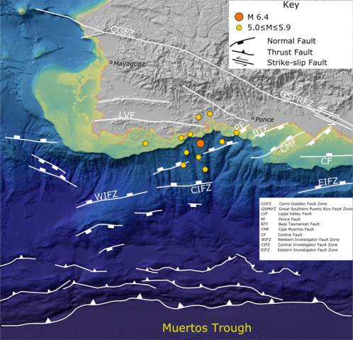 Photo credit: Map of southwestern Puerto Rico and its offshore area showing topography taken from the NOAA DEM Color Shaded Relief layer with the location of active faults taken from Bruna et al. 2015 and Mann et al. 2005 and epicentres of earthquakes of the 2019-2020 Puerto Rico earthquake sequence taken from ANSS
