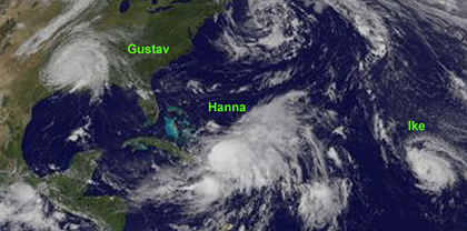Photo Credit: This GOES satellite image from September 2 shows Gustav (over Texas), Hanna (in the Bahamas), and Ike. NASA/NOAA GOES Project