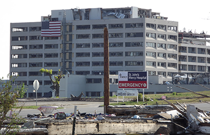 The 2011 catastrophic EF5 multiple-vortex tornado that hit Joplin, MO the late afternoon of May 22, 2011 reached a width of 1 mile wide, killing 158 and injuring 1,150 others. St. John's Medical Center, one of two medical hospitals in Joplin, MO was completely destroyed from a direct hit by the tornado.