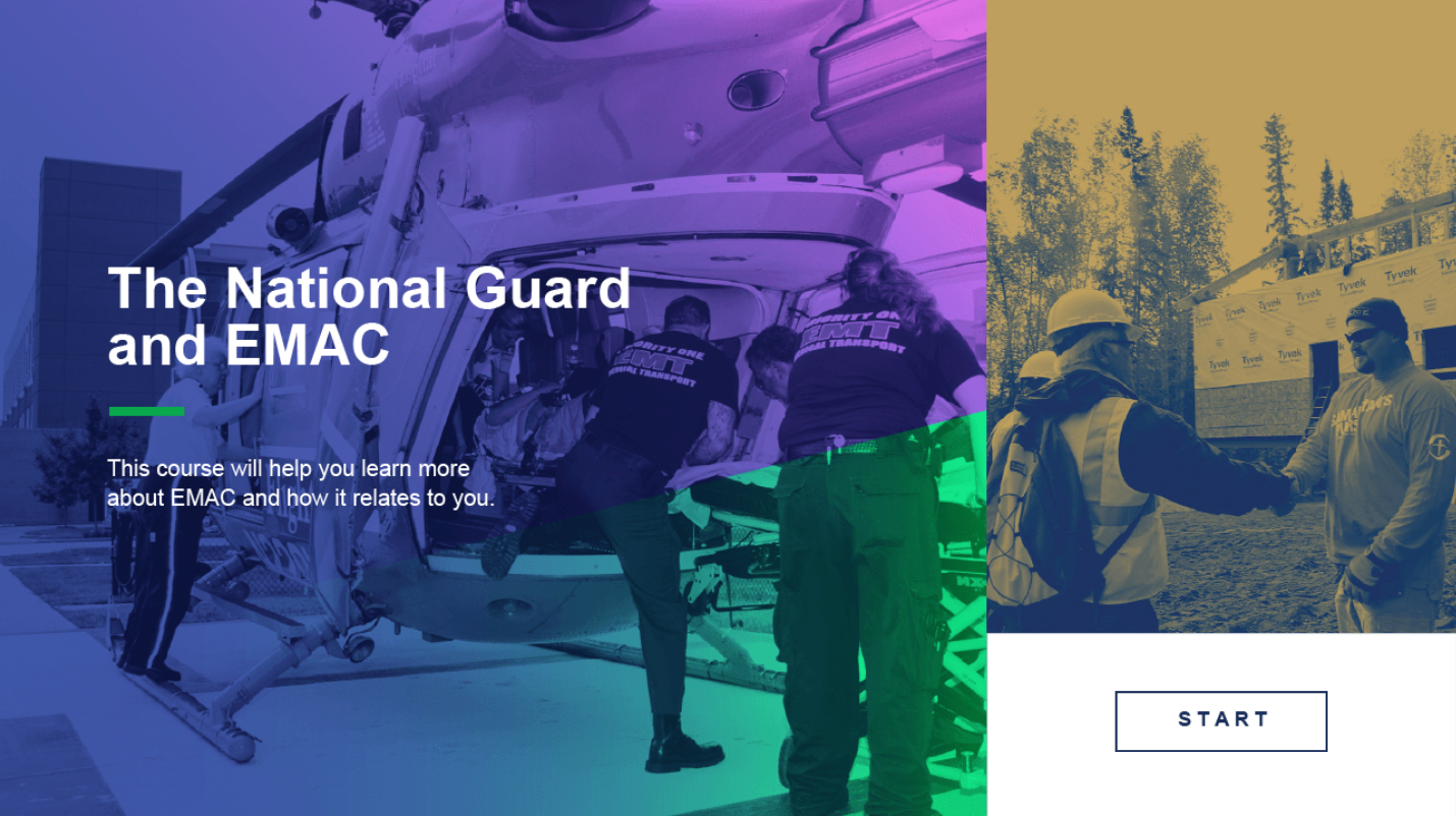 This course provides an overview of the EMAC Process, EMAC law, EMAC Governance, National Guard responsibilities throughout the EMAC Process, as well as insight into the unique aspects between State Emergency Management Agencies, EMAC, and the National Guard.